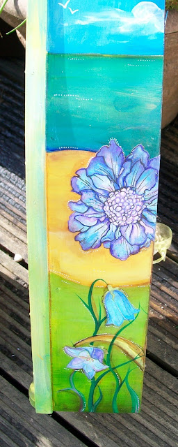 I added some spotty detail with a uni ball gel pen and a couple of distant seagulls and added three more coats of lacquer, allowing good drying time in between coats. (note the spray-painted chives..... I'm a nightmare with a spray can in my hand - I wanna paint everything!!)