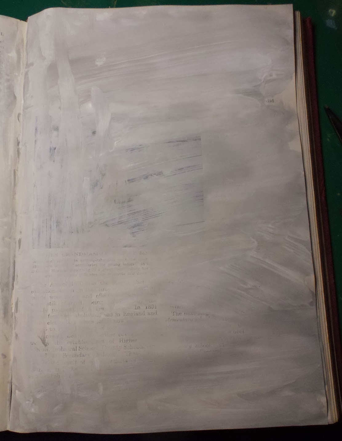I chose a page from this book for my base paper, 'cos at some point I'll most likely gut it and use the cover for a new journal - also I like book text as a background, but you can choose anything you like, including junk mail, scrapbook papers or even newspaper.